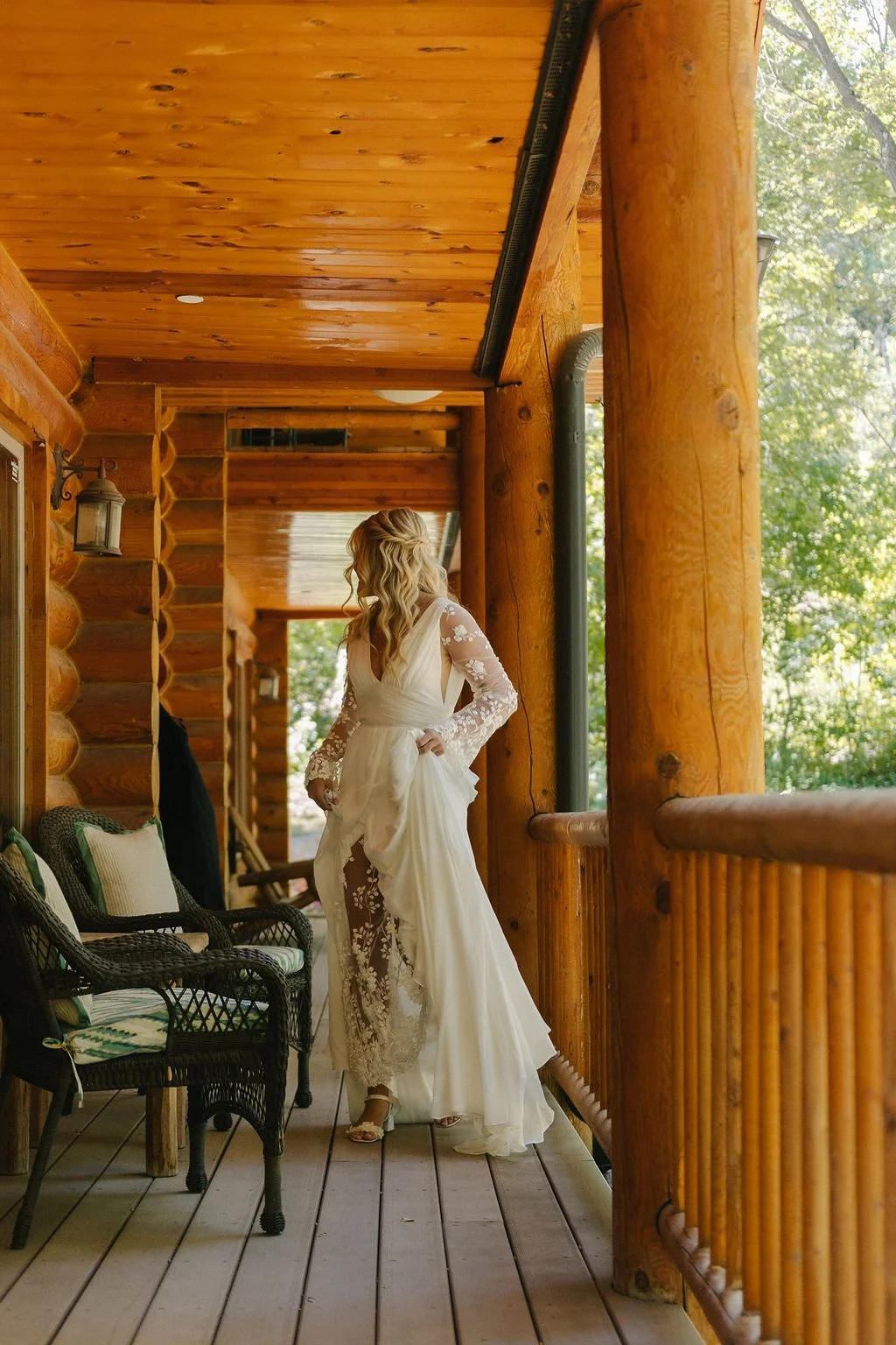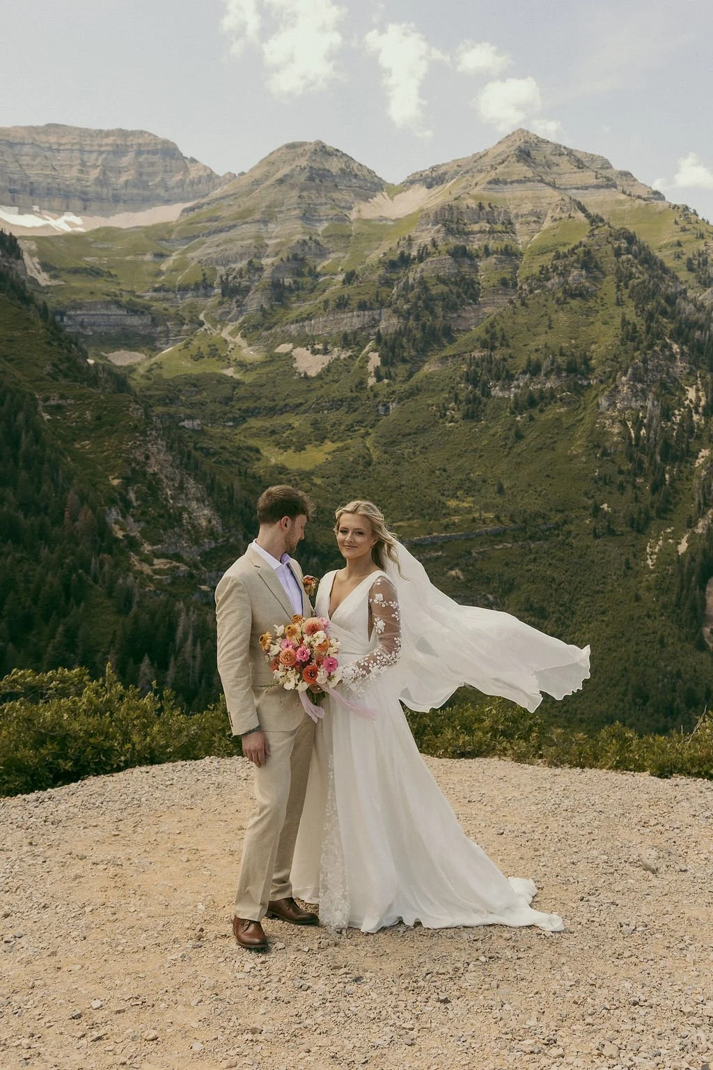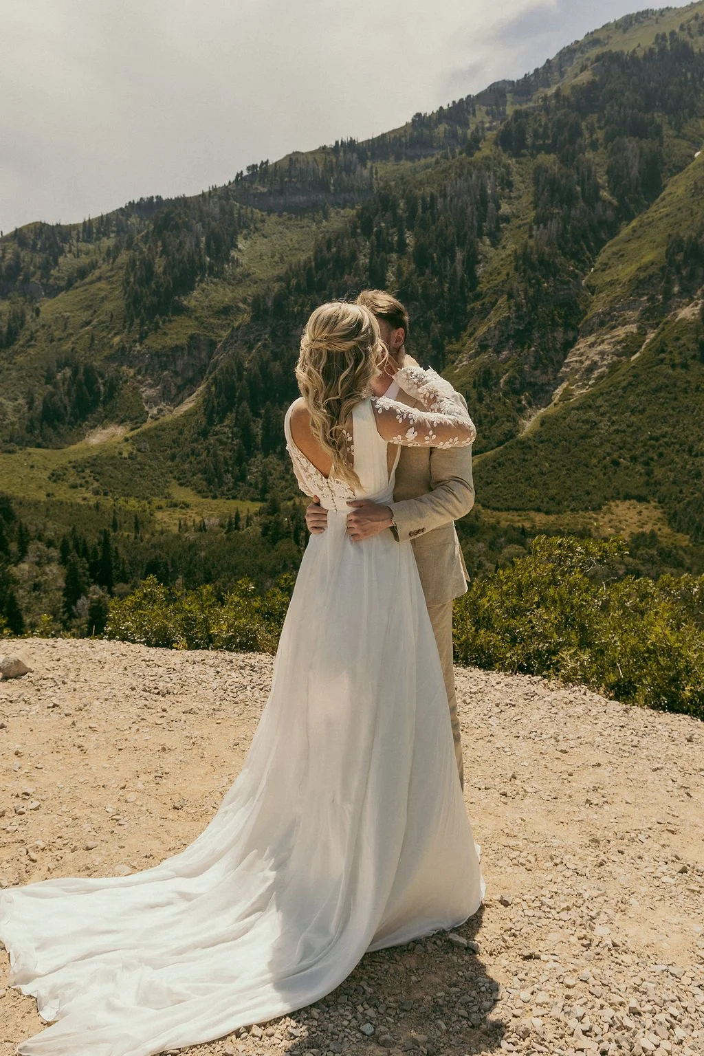 From the beginning, Kyra knew she wanted a gown that would move with the mountain breeze rather than fight it. Silk chiffon was the perfect choice. Lightweight, airy and incredibly fluid, it allowed her dress to float with every step, every spin and every hug.